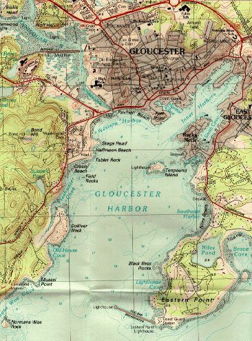 From the West: Gloucester harbor opens wide and is marked by a breakwater. Green bell (1) off Norman's Woe should be kept to port.
